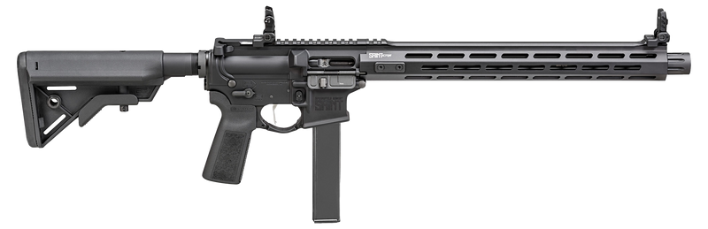 Semi-automatic pistol-caliber carbine chambered in 9mm Luger with a 16" CMV Melonite barrel featuring a 1:10 twist rate. Equipped with a B5 Systems Bravo collapsible stock, B5 Systems Type 23 P-Grip, M-LOK free-float handguard, flip-up adjustable sights, and SA 9mm Forward Blast Diverter. Forged 7075 T6 aluminum receivers with Type III hard coat anodize, accepts 32+1 round Colt-pattern magazines, and weighs 6.9 lbs with an overall length of 31.75" to 35".
