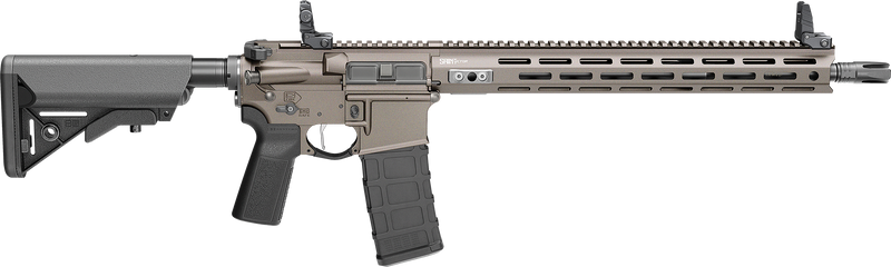 Semi-automatic AR-platform rifle chambered in 5.56 NATO with a 16" chrome moly vanadium barrel featuring 1-in-8 twist rate and 1/2x28 threading. Built on a 7075-T6 aluminum receiver with tungsten gray cerakote finish, this rifle includes a B5 Systems enhanced SOPMOD collapsible stock, B5 Type 23 pistol grip, M-LOK free-float handguard, low-profile adjustable flip-up iron sights, and ambidextrous safety. Weighs 6.12 lbs and ships with one 30-round Magpul PMAG.