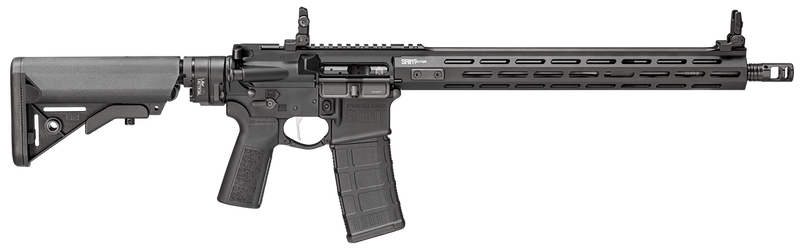 Semi-automatic AR-15 style rifle chambered in 5.56 NATO with a 16" black Melonite steel barrel and 30+1 capacity. Features a hard coat anodized aluminum receiver, M-LOK free float handguard, B5 Enhanced SOPMOD collapsible stock with LAW Tactical folding adapter, adjustable flip-up sights, and SA multiport muzzle brake. Weighs 7.3 lbs with overall length ranging from 26.5" to 38" when stock is collapsed or extended.