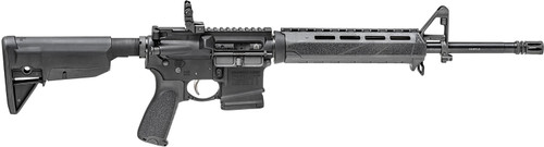 Semi-automatic rifle chambered in 5.56x45mm NATO with a 16" lightweight barrel and 30+1 capacity. Features a flat modular match trigger, ambidextrous safety lever, flip-up front and rear sights, and a BCM Gunfighter SOPMOD stock. Weighs 6.30 lbs with an overall length of 32.50" to 35.75".