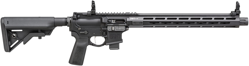 Semi-auto rifle chambered in 9mm Luger with a 16" steel barrel and 10+1 capacity. Features a B5 Systems Bravo collapsible stock, B5 Type 23 grip, flip-up front and rear sights, M-LOK free float handguard, and SA 9mm forward blast diverter. Weighs 6.15 lbs and has an overall length of 31.75" to 35".