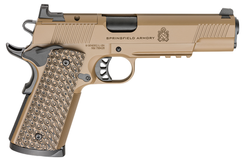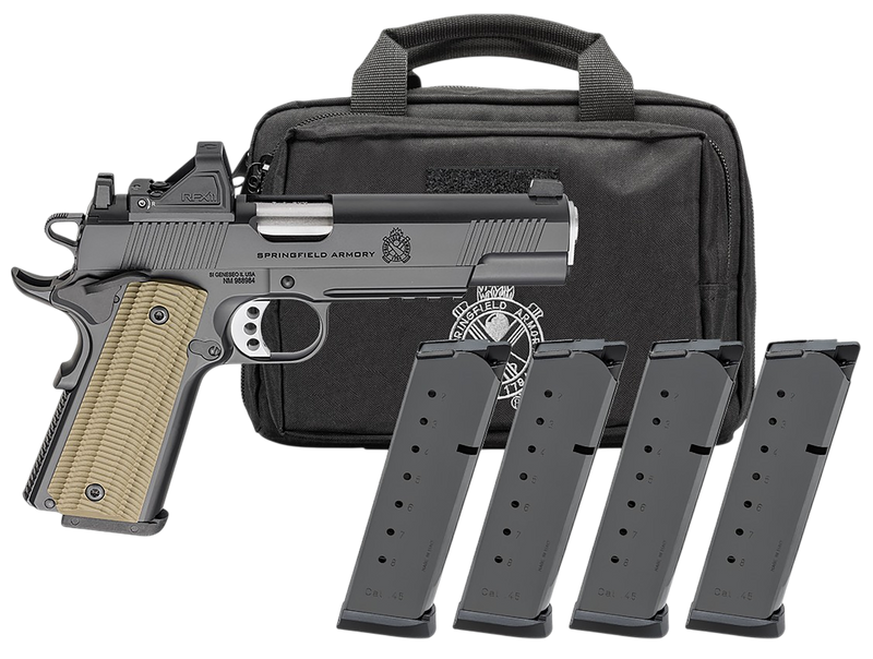 The Springfield 1911 Operator AOS is a single-action semi-automatic pistol chambered in .45 ACP with a 5" match-grade barrel and 8+1 round capacity. This full-size steel-frame pistol features an optic-ready slide, VZ G10 grips, ambidextrous thumb safety, and includes a factory-installed Viridian RFX11 green dot sight, 4 magazines, and a protective pistol case.