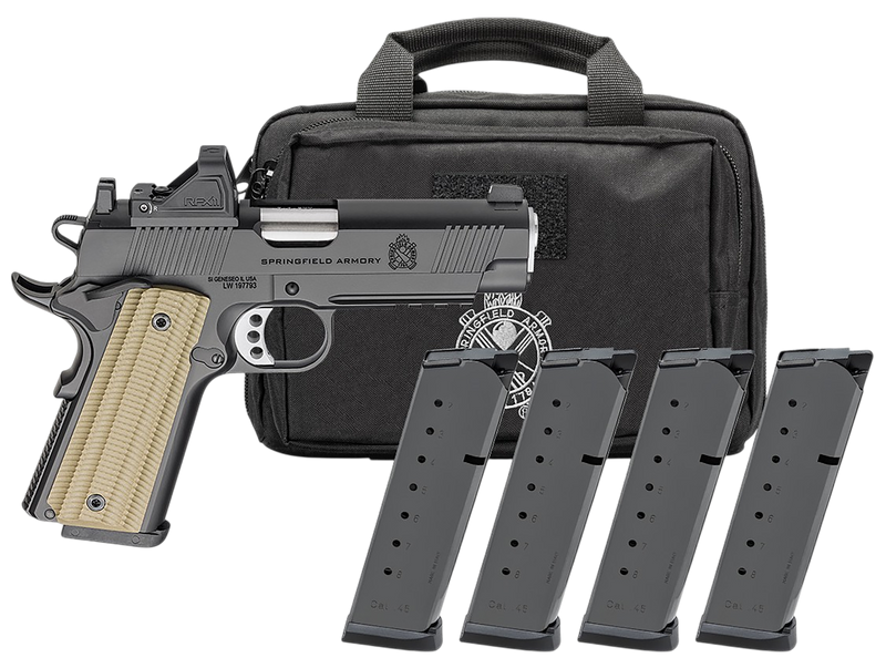 Semi-automatic 1911-style pistol chambered in 9mm Luger with a 4.25" match-grade barrel and 9+1 capacity. Features an optic-ready slide (AOS system), VZ G10 grips, ambidextrous thumb safety, tritium night sights, and includes a factory-installed Viridian RFX11 green dot optic, four 9-round magazines, and a carrying case. Weighs approximately 31-32 oz with an overall length of 7.9".