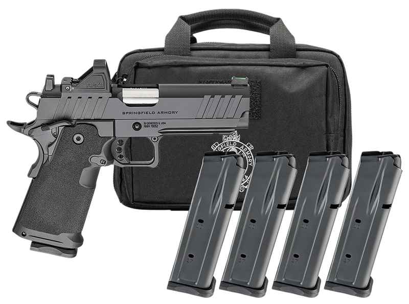 Springfield's 1911 DS Prodigy is a semi-automatic 9mm pistol with a 4.25" forged stainless steel match-grade barrel and double-stack polymer grip module, delivering 20+1 round capacity. The optics-ready slide features fiber optic front and serrated rear sights, ambidextrous safety, and includes a factory-installed Viridian RFX11 green dot optic. This gear pac package comes with four magazines (three 17-round, one 20-round) and a pistol bag.