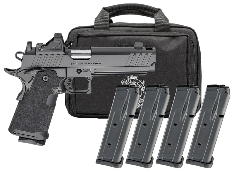 Semi-automatic 1911-style pistol chambered in 9mm Luger with a 5" forged stainless steel bull barrel and integral compensator. Features optics-ready slide, ambidextrous safety, double-stack magazine system with 20+1 capacity, and includes Viridian RFX11 green dot optic, 4 magazines, and range bag. Weighs 33 oz with 8.5" overall length.