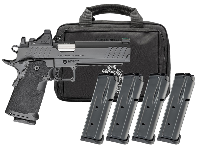 Semi-automatic 1911 DS Prodigy in 9mm Luger with 5" forged stainless steel barrel and 20+1 round capacity. Features optic-ready slide with ambidextrous safety, fiber optic front and serrated rear sights, factory-installed Viridian RFX11 green dot, polymer grip module, and includes 4 magazines (three 17-round and one 20-round), range bag, and weighs 33 oz.