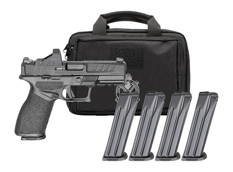 The Springfield Echelon 4.0 FC is a semi-automatic, striker-fired 9mm pistol with a 4" barrel, full-size polymer frame, and 15-round capacity. It features an optics-ready slide with integrated Variable Interface System, tritium/luminescent U-Dot fixed sights, and a Viridian RFX11 green dot sight. This gear pac package includes 4 magazines, the optic, and a range bag.