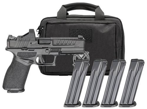 The Springfield Echelon is a striker-fired, semi-automatic 9mm pistol with a 4.5" hammer-forged, Melonite-finished barrel and 10+1 round capacity. This full-size polymer-framed handgun features an optics-ready slide with integrated VIS mounting system, Viridian RFX11 green dot optic, fixed white dot front sight, and tactical rack U-notch rear sight. The Gear Pac includes four 10-round magazines, a heavy-duty range bag, and weighs 23.9 oz.