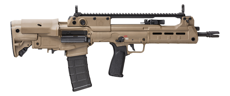 Semi-automatic bullpup rifle chambered in 5.56x45mm NATO (.223 Rem) with a 16" hammer-forged barrel featuring a 1:7 twist rate and 4-prong flash hider. Features a 5-position adjustable stock with cheek riser, ambidextrous controls, low-profile flip-up front and rear sights, M-Lok handguard, and 2-position short stroke gas piston system. Ships with one 30-round Magpul PMAG and weighs 8 lbs.