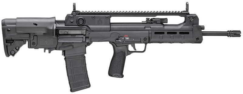 Semi-automatic bullpup rifle chambered in 5.56 NATO with an 18" hammer-forged barrel and 1:7 twist rate. Features ambidextrous controls, adjustable stock with cheek riser, low-profile flip-up sights, 4-prong flash hider, M-LOK handguard, and reversible ejection system. Weighs 8.19 lbs with overall length of 30.25" to 31.75".