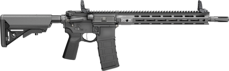 Semi-automatic AR-15 style rifle chambered in 5.56 NATO with a 14" pinned and welded chrome moly vanadium barrel featuring a 4-prong flash hider. Features a forged 7075-T6 aluminum receiver, B5 Systems Enhanced SOPMOD stock, low-profile adjustable flip-up sights, ambidextrous safety, and M-LOK free-float handguard. Weighs 6.12 lbs with an overall length of 33.25" to 36.75" and includes one 30-round magazine.