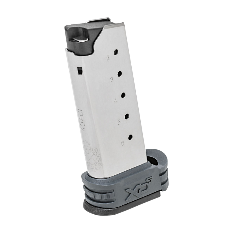 Springfield Armory XD-S 6-round magazine chambered in .45 ACP with stainless steel construction and gray finish. Designed for original XD-S models. Dimensions: 8.5" length x 3.7" width x 1.5" height.