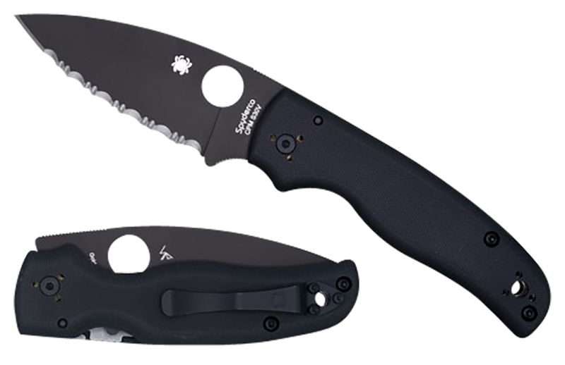 The Spyderco Shaman features a 3.58" CPM S30V stainless steel blade with black DLC coating and a plain edge, paired with a black textured G10 handle. It opens via thumb hole mechanism and includes a pocket clip for convenient carry. Overall length is 8.25" when open, weighing 5.20 oz.