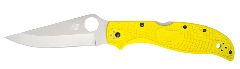 The Spyderco Stretch 2 XL Lightweight is a compact folding knife featuring a 3.95" H2 steel blade with a plain edge and satin stonewashed finish. The yellow fiberglass-reinforced nylon (FRN) handle with bi-directional texturing provides secure grip and weighs just 3 ounces, making it ideal for everyday carry and outdoor use.