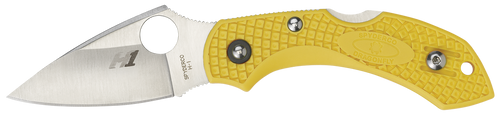The Spyderco Atlantic Salt is a lightweight everyday carry folding knife featuring a 3.69" H2 steel sheepsfoot blade with serrated edge. The yellow FRN handle includes a pocket clip and uses a thumb slot opening mechanism, weighing just 2.75 oz for easy portability.