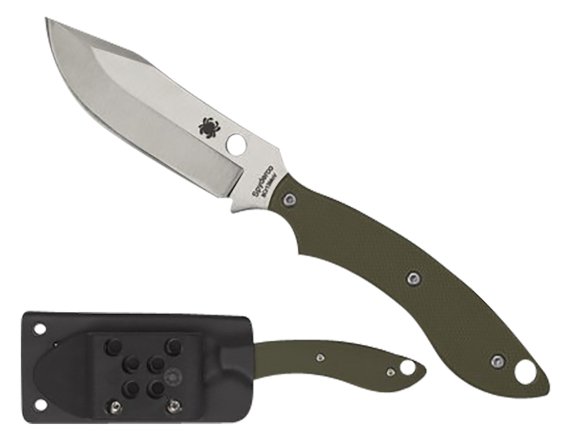 The Spyderco Stok is a fixed blade knife featuring a 2.95" stonewashed 8Cr13MoV stainless steel Bowie blade paired with an olive drab textured G10 handle. The knife has an overall length of 6.45" and weighs 2.10 oz, with a Boltaron sheath that includes a G-clip for carry options.