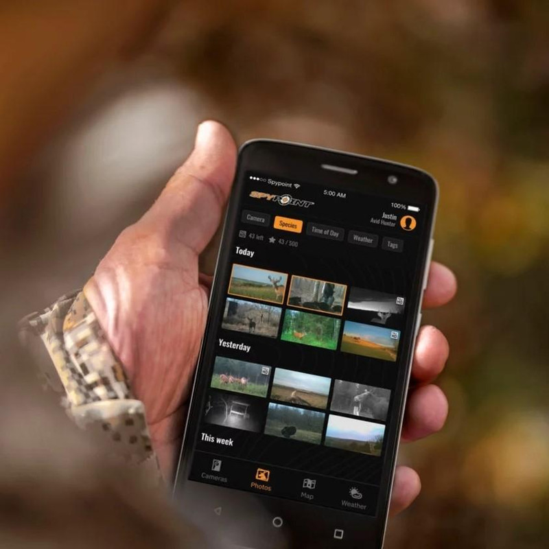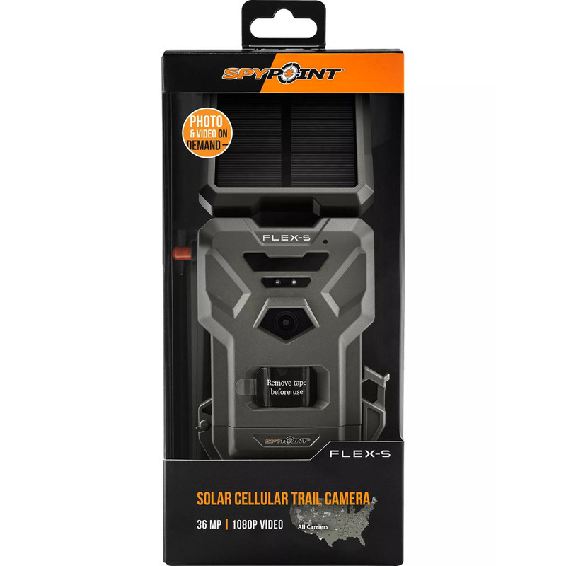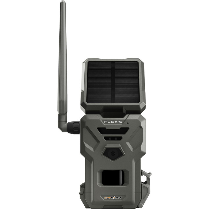 The Spypoint Flex-S is a cellular trail camera with integrated solar panel charging for extended battery life. It features 36MP image resolution, 1080p video recording, dual SIM slots, 100 ft PIR sensor range, and blackout LED flash. The camera connects via the Spypoint App and includes a strap and 1/4-20 threaded mounting system.