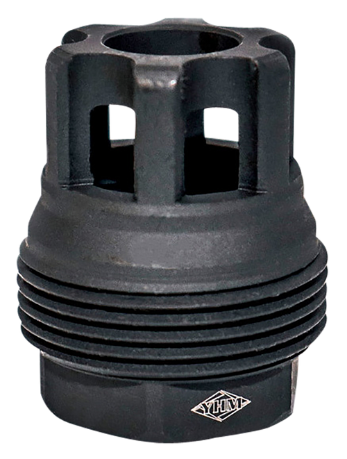 The YHM sRx Mini Muzzle Brake is a quick-detach muzzle device designed for 30 caliber rifles with 5/8"-24 thread pitch. It features a black phosphate steel construction with an internal taper seal and attaches to industry-standard 1-3/8" x 24 threads on compatible suppressors. This compact brake includes a shim kit for easy installation and alignment.