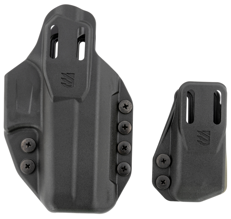The Blackhawk Stache Premium Kit is an inside-the-waistband holster designed for Glock 19/23/32/44/45 pistols, featuring an ambidextrous belt clip mount for versatile carry options. Constructed from black polymer, this premium kit includes a magazine carrier and is suitable for both right and left-handed shooters. The compact design measures 11.6" in length with a 5.7" width and 2.5" height.