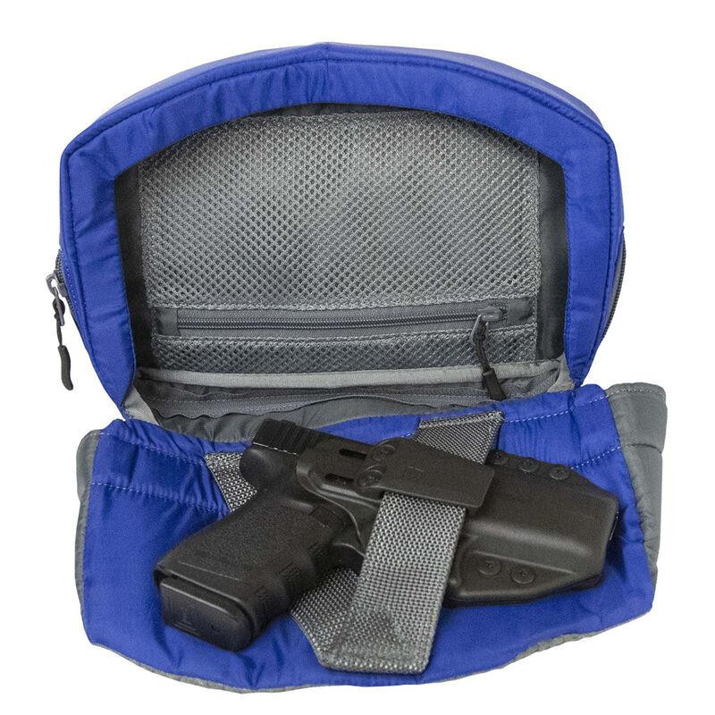 The Blackhawk Stache R.A.H.C. is a low-profile belt pack holster constructed from lightweight 200D polyester with double-layer 1.5" scuba webbing configured in a "V" shape for ambidextrous carry. Designed for active use such as running or situations where a traditional belt cannot be worn, it provides discreet firearm access without drawing attention. The large size accommodates full-size and compact handguns.