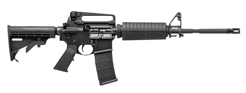 Semi-automatic AR-15 platform rifle chambered in 5.56x45mm NATO with a 16" chrome-lined barrel featuring a 1:7" twist rate. Includes mil-spec 6-position adjustable stock, A2 flash hider, A2 carry handle rear sight, and A2 front sight post. Ships with 30+1 round capacity magazine and weighs 6.75 lbs.