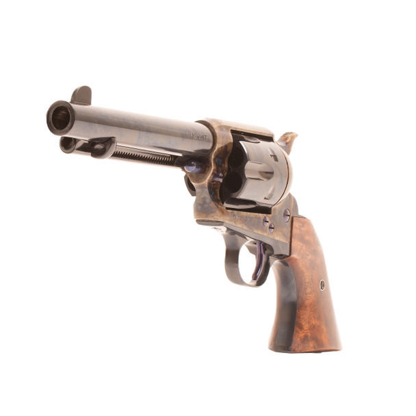 Single-action revolver chambered in .45 Colt with a 5.5" barrel and 6-round capacity. Constructed from solid 4140 steel with precision in-house machining and case-colored finish. Features fixed sights and a 2-piece grip.