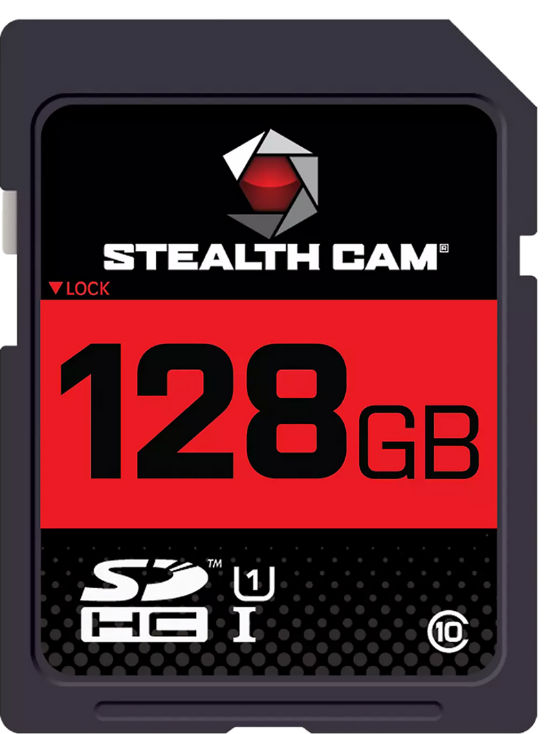 High-speed 128GB SD card designed for use with Stealth Cam trail cameras and compatible digital devices featuring SD card slots. Features Speed Class 10 performance with low power consumption and high-speed data transfer capabilities for reliable photo and video storage.