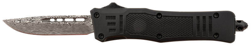 The Steel River Knives Spartan Mini features a 2.75" drop point blade crafted from 440C stainless steel with laser-etched Damascus pattern and plain edge. The knife has a 4.25" black aluminum zinc alloy handle and weighs 4.50 oz, making it a compact option for everyday carry or general utility tasks.