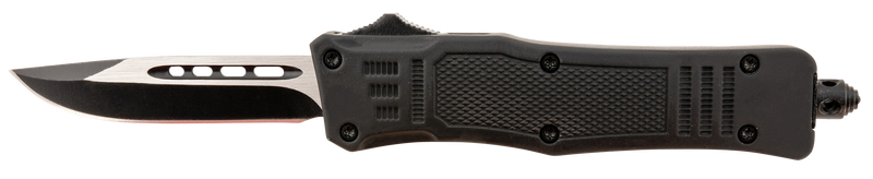 The Steel River Knives Spartan Mini features a 2.75" drop point blade made from 440C stainless steel with a plain edge and OTF (out-the-front) deployment mechanism. The knife has a 4.25" black aluminum zinc alloy handle and weighs 4.50 oz, making it a compact EDC option. This is a genuine folding knife suitable for general cutting tasks and everyday carry.