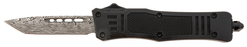 The Steel River Knives Spartan Mini features a 2.75" Damascus 440C stainless steel Tanto blade with plain edge and laser etching. The knife includes a 4.25" black aluminum zinc alloy handle and weighs 4.50 oz, making it a compact OTF (out-the-front) option for everyday carry or general cutting tasks.