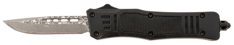 The Steel River Knives Spartan Mini features a 2.75" drop point blade made from real Damascus steel with a plain edge. This OTF (out-the-front) folding knife has a black aluminum zinc alloy handle and measures 4.25" closed, making it a compact carry option weighing 4.50 oz.