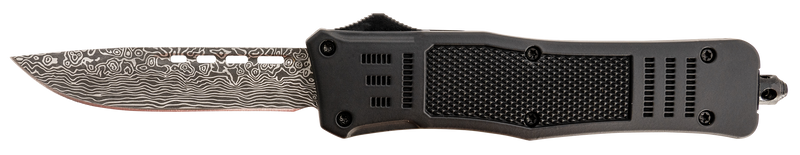 The Steel River Knives Spartan is a medium folding knife featuring a 3.25" drop point blade crafted from 440C stainless steel with laser-etched Damascus pattern. It has a black aluminum zinc alloy handle measuring 4.50" when open, making it suitable for general cutting tasks and outdoor use.