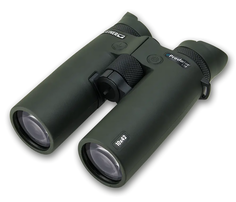 The Steiner ePredator LRF is a 10x42mm laser rangefinding binocular designed for hunters, wildlife observers, and tactical professionals. It features a precision laser rangefinder capable of measuring distances from 15 meters to 3000 meters with display options in meters or yards, integrated with Bluetooth connectivity. Fully multi-coated optics provide exceptional clarity, while the binocular is fog proof, shockproof, and waterproof with fast-close focus.