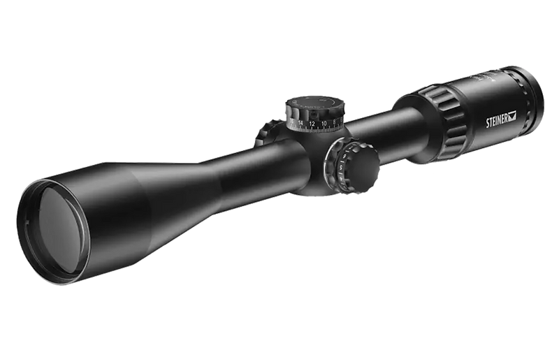 The Steiner H6Xi is a 5-30x magnification riflescope with a 50mm objective lens and 30mm main tube, featuring an illuminated Modern Hunter reticle in first focal plane. Built with military-grade ruggedness and American craftsmanship, it delivers 25-4.5 degrees field of view at 100 meters with side focus parallax adjustment. Fog proof, shockproof, and waterproof construction in a matte black finish weighing 1.76 lbs with 9.4-3.3 inches of eye relief.