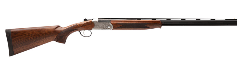 The Stevens 555 Enhanced is a break-action over/under shotgun chambered in .410 Bore with a 26" vented rib barrel and 2-round capacity. The engraved satin silver aluminum receiver pairs with a fixed Turkish walnut stock, and five interchangeable choke tubes (C, IC, M, IM, F) are included. The ambidextrous design accommodates both right- and left-handed shooters with a single selective mechanical trigger and manual safety.