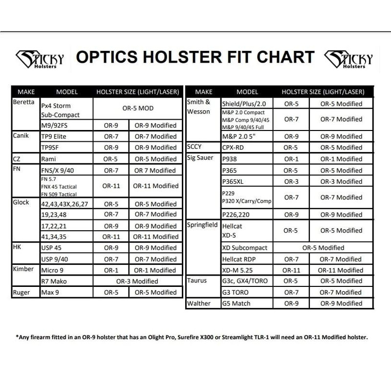 Ambidextrous pocket holster designed to accommodate firearms with optic systems, including Glock 34/35/41, FN 509 Tactical, and Springfield XD-M 5.25" pistols with mounted lights or lasers. Sticky Holsters' proprietary design provides secure retention while allowing for versatile carry options. Multi-fit construction allows compatibility with various firearm and optic setups.