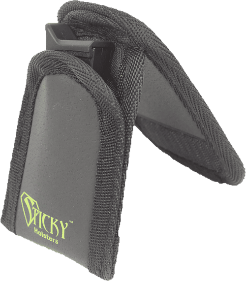Inside-the-waistband or pocket-carry magazine pouch designed to hold pistol magazines, flashlights, and small accessories. Features Sticky Holsters' self-securing exterior for secure retention without snaps or straps, and is compatible with double-stack and large single-stack 1911-style magazines. Latex-free construction available in multiple color options.