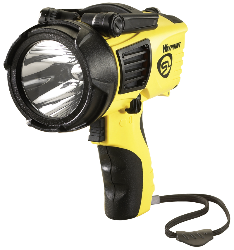 The Streamlight WayPoint is a handheld spotlight delivering 550 lumens with a 40-lumen low mode, featuring a white LED and yellow polycarbonate construction. It operates on four C alkaline batteries or 12V DC power and includes a pistol grip trigger switch with three lighting modes. Designed for illumination tasks, it offers impact and water resistance with a maximum beam distance of 625 meters.