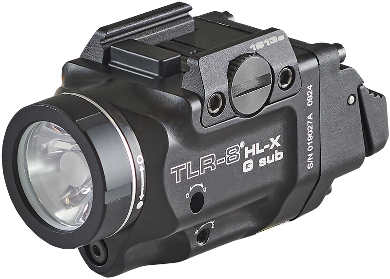 The TLR-8 HL-X Sub is a rail-mounted tactical light engineered to produce a longer-reaching beam with 1,000 lumens output and an integrated green laser. It accepts either Streamlight's SL-B9 USB-C rechargeable battery or a CR123A lithium battery, and features interchangeable rear paddle switches for different shooting styles. The light mounts to M1913 short rails and includes a mounting kit, multi-tool, battery pack, and USB-C charging cord.