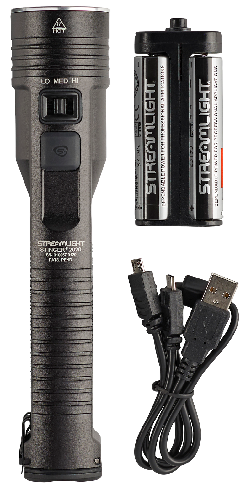 The Streamlight Stinger 2020 is a rechargeable LED flashlight delivering up to 2,000 lumens with three brightness modes (high, medium, low) plus strobe functionality. It features an IPX7 waterproof rating, SL-B26 rechargeable lithium-ion battery, and USB charging capability. The compact 7.67-inch design with push-button tail cap switch makes it suitable for tactical, law enforcement, and outdoor applications.