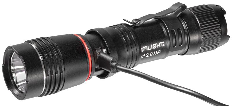 The ProTac 2.0 HP is a rechargeable tactical flashlight producing up to 2000 lumens with a 583-meter beam distance and 85,000 candela intensity. It features TEN-TAP programming with three user-selectable modes (High/Strobe/Low, High Only, or Low/Medium/High) and uses a removable SL-B50 Li-Ion USB-rechargeable battery pack with runtime up to 31 hours on low. The light is constructed from aluminum, IP67 waterproof-rated, and includes a USB charging cord and nylon holster.