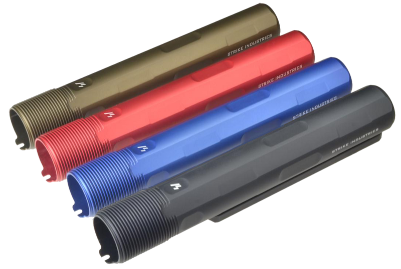 This Strike Industries Advanced Receiver Extension is a mil-spec buffer tube designed for AR-15 and AR-10 platform rifles. Constructed from red anodized aluminum, it measures 9.0 inches in length and provides a reliable foundation for stock installation on both direct impingement and piston-driven systems.