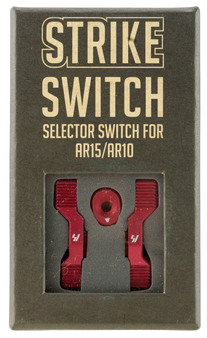 The Strike Industries Strike Switch is a 60/90 degree ambidextrous safety selector for AR-platform rifles, constructed from red anodized aluminum. This thumb-operated safety features a 2.4-inch width and provides enhanced ergonomics for both left and right-handed shooters. Designed as a drop-in replacement part for standard AR safety mechanisms.