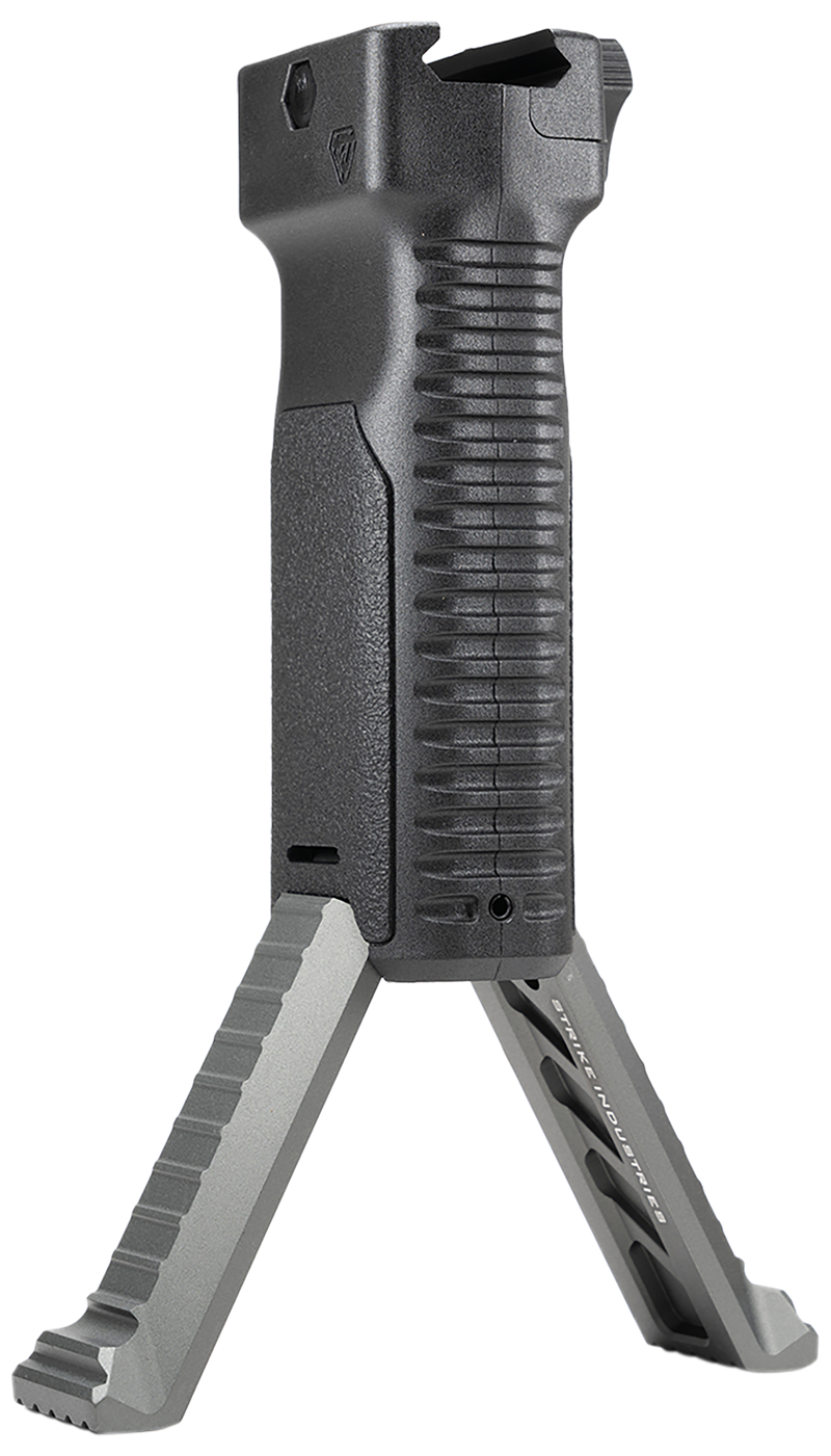 The Strike Industries Bipod Grip is a gray polymer grip designed for AR-platform firearms. This accessory combines ergonomic grip design with integrated bipod functionality, measuring 8.4" in length with a 6.2" width and 2.0" height. The polymer construction provides lightweight durability and is compatible with standard AR-15 platform rifles.