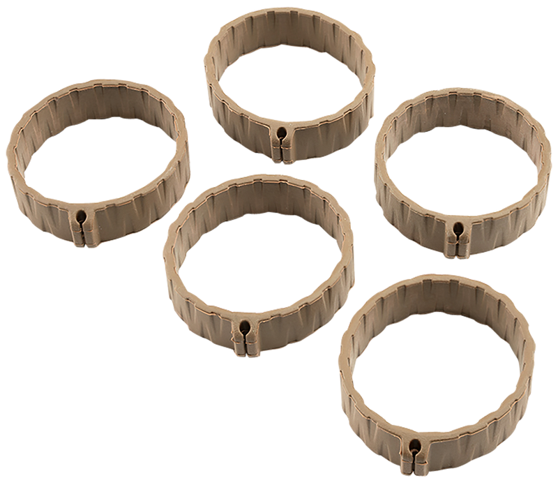 The Strike Industries Bang Band is a rubber cable management accessory designed to organize and protect firearm cables and hoses. Made from durable flat dark earth rubber with dimensions of 8.3" x 4.0" x 0.7", this 5-pack offers universal compatibility across most rifle platforms. The bands secure cables and routing with a simple wrap-and-secure installation method.