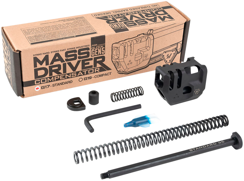 The Strike Industries Mass Driver Compensator is a muzzle device designed for the Glock 17 Gen 5 in 9mm, engineered to reduce recoil and muzzle rise during firing. Constructed from steel, it measures 6.9" in length with a 2.0" width and 1.9" height. The compensator includes a recoil spring, guide rod, guide rod fitment washer, and guide rod head for installation.
