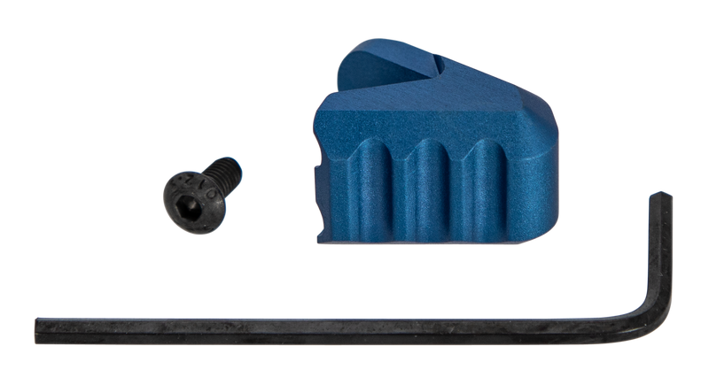 The Strike Industries ISO Tab is a blue anodized aluminum accessory designed for AR-15 platform firearms. This extended tab measures 5.9" L x 4.4" W x 0.8" H and provides a functional mounting or grip enhancement option for tactical builds.
