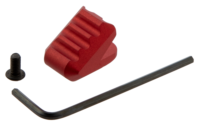 The Strike Industries ISO Tab is a red anodized aluminum accessory designed for AR-15 platform rifles. This extended tab measures 5.6" in length with a 4.4" width and 0.6" height, providing a mounting solution for compatible AR systems. Constructed from durable aluminum, it integrates with standard AR-15 configurations.