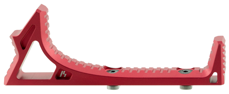 The Strike Industries Link Curved Foregrip is a red aluminum accessory designed for AR-platform rifles with M-LOK and Keymod mounting options. This foregrip measures 5.6" in length with a 2.2" width and 1.74" height, providing ergonomic control and improved handling. The curved design and lightweight aluminum construction make it suitable for tactical and sport shooting applications.