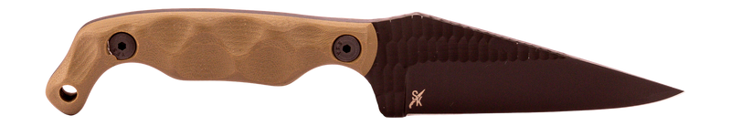 The Stroup Bravo 5 is a fixed blade knife featuring a 3.5" Wharncliffe blade made from 1095 high carbon steel with an acid etched finish and plain edge. The 7.75" overall length knife has a Cerakote-finished handle in black with Olive Drab Green G10 scales and includes a Kydex sheath. This knife is subject to California Proposition 65 warnings and state restrictions apply.